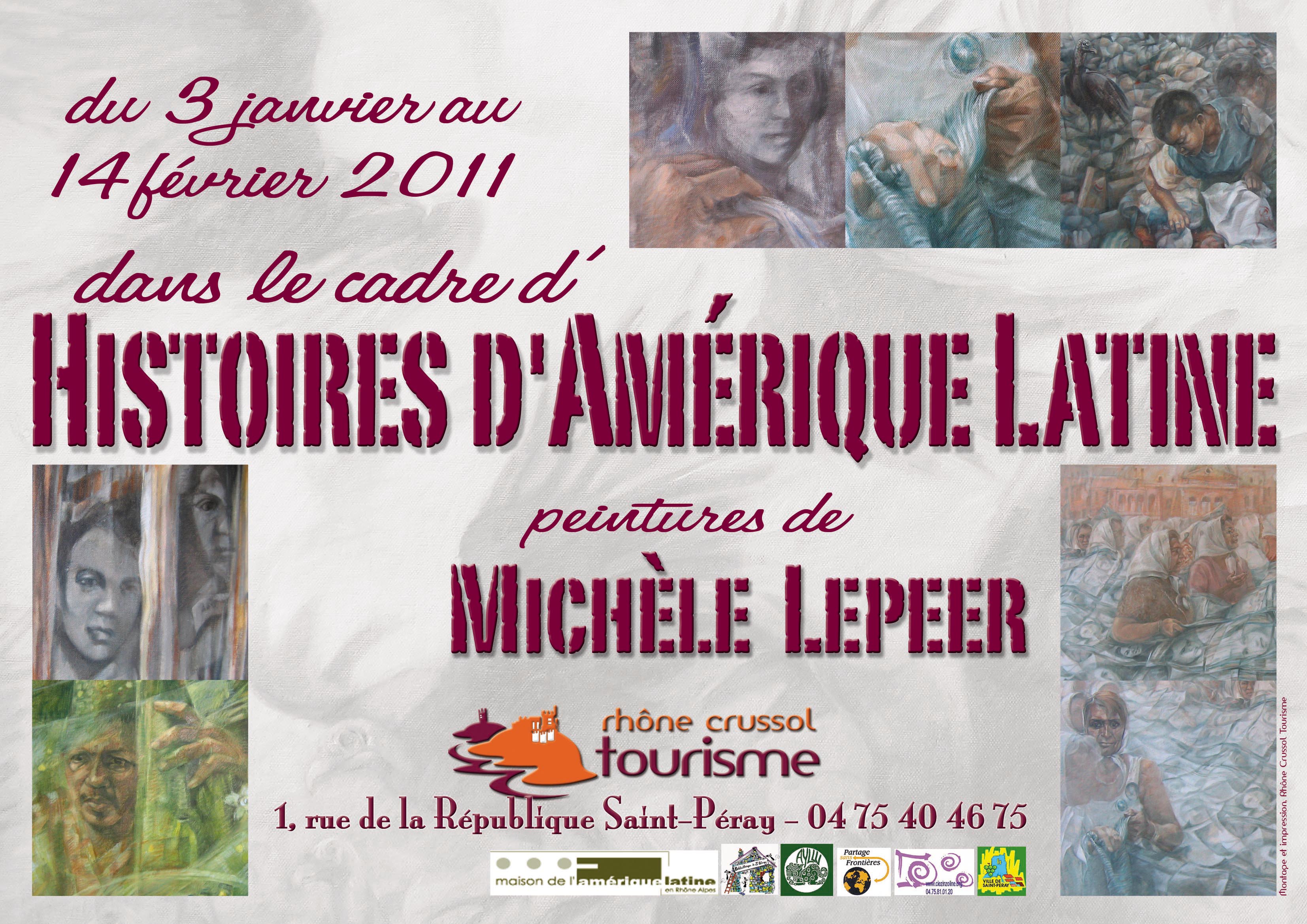 - du 02 au 05/02/2011 : dixième semaine "Histoires d'Amérique latine" à Saint-Péray, la Cacharde (07), le programme est à votre disposition au format Html et au format PDF. L'affiche de l'exposition à l'office de tourisme est ici, ainsi que l'invitation. Les photos de l'inauguration de l'exposition de peinture de Michèle Lepeer sont à votre disposition. Les photos du spectacle de Gilbert Brossard Année 1850 - Native American et le journal de Sarah 10 ans. Les photos de la lecture de texte latino-américains. Les photos de la journée avec Juan Carlos Cacères.