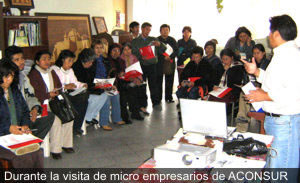En el marco del desarrollo del Proyecto "Tejido, Competitividad y Asociatividad Empresarial", el día 10 de Agosto visitaron a las instalaciones CIAP cerca de 60 micro empresarios y microempresarias, con la finalidad de intercambiar experiencias, conocer el funcionamiento de CIAP y sus empresas sociales, sus formas asociativas, organizativas y comerciales. ACONSUR organiza este tipo de experiencias en su afán de buscar para sus beneficiarios la mejor forma de organización ya que están en busca de un modelo organizativo que les permita desarrollar su actividad en forma competitiva.